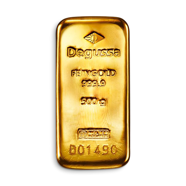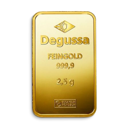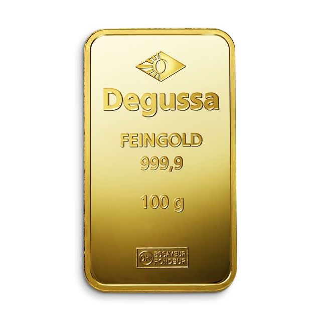 We offer the world-famous Degussa gold bars and ingots in weights ranging from 1 gram up to 1 kilogram. All have the highest gold standard fineness of 999.9/1000.