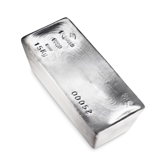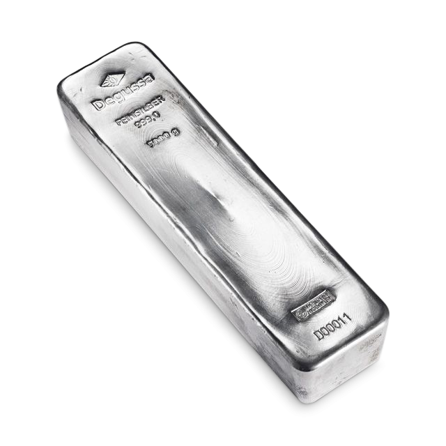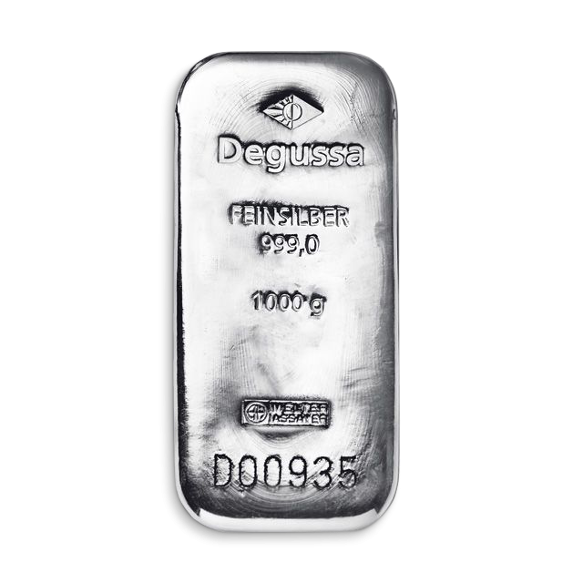 Degussa silver bars come in 1 oz and 100 g minted versions. Traditional cast 500 g, 1,000 g, 5,000 g and 15,000 g silver ingots are also available for immediate delivery.