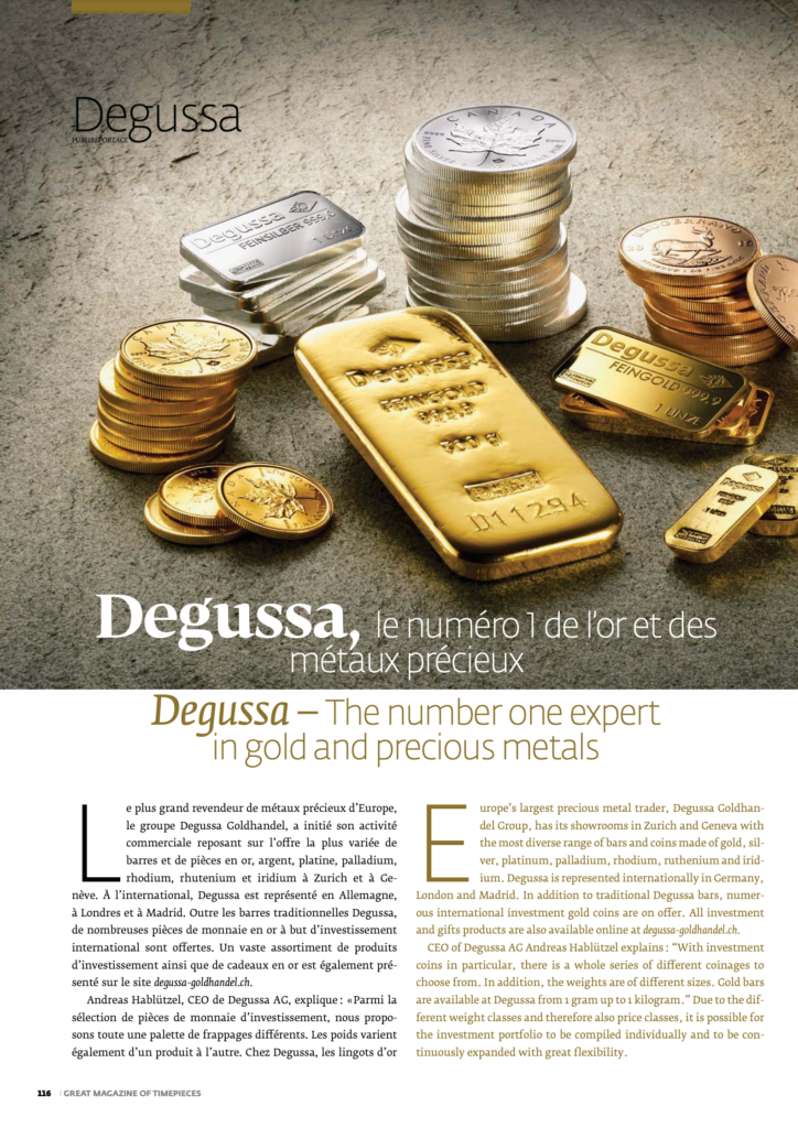 Europe’s largest precious metal trader, Degussa Goldhandel Group, has its showrooms in Zurich and Geneva with the most diverse range of bars and coins made of gold, silver, platinum, palladium, rhodium, ruthenium and iridium. Degussa is represented internationally in Germany, London and Madrid. In addition to traditional Degussa bars, numerous international investment gold coins are on offer. All investment and gifts products are also available online at degussa-goldhandel.ch.