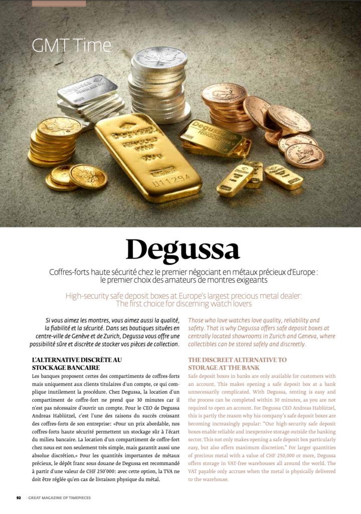 Those who love watches love quality, reliability and safety. That is why Degussa offers safe deposit boxes at centrally located showrooms in Zurich and Geneva, where collectibles can be stored safely and discreetly.