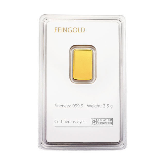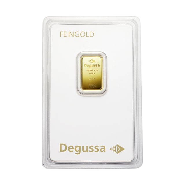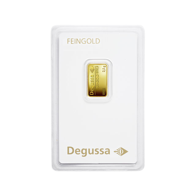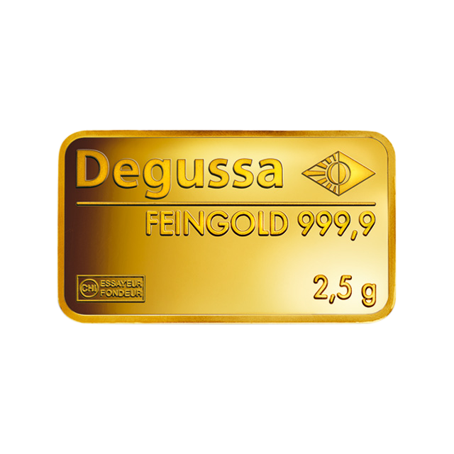 The Degussa gold bars are offered in weights ranging from 1 gram up to 1 kilogram. All have the highest gold standard fineness of 999.9/1.000. The bars up to 50 grams are stamped, the larger ingots come in the classic cast form. Our 100 g bars are available in both cast and minted formats. Our Degussa gold bars are recognized by the traditional symbol of a diamond made out of the sun and moon.