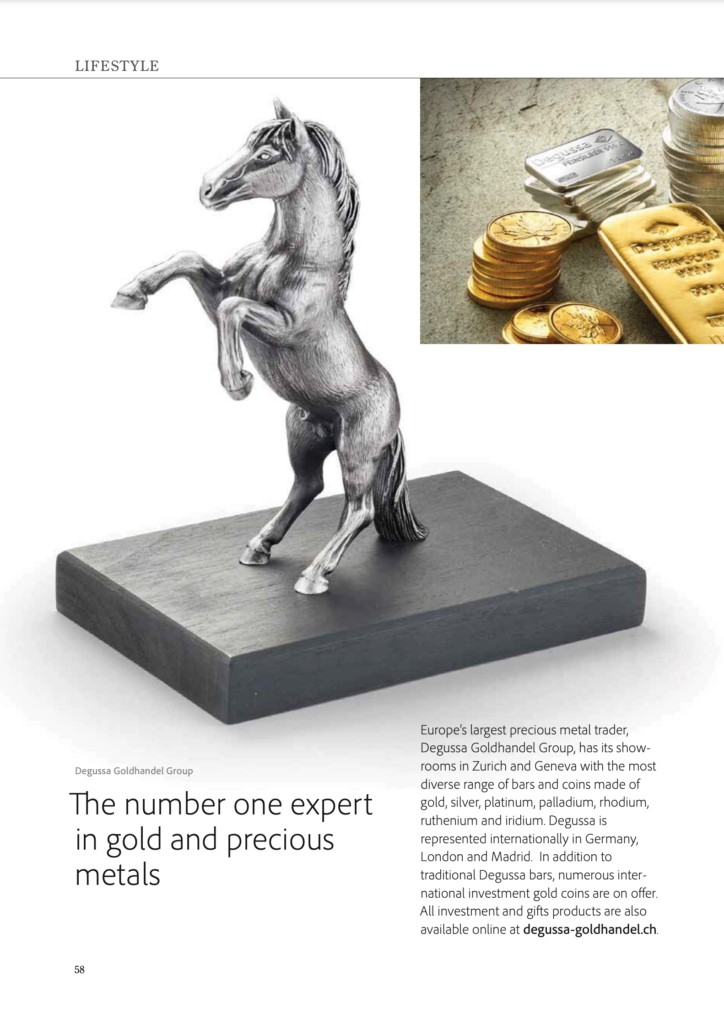 Europe’s largest precious metal trader, Degussa Goldhandel Group, has its showrooms in Zurich and Geneva with the most diverse range of bars and coins made of gold, silver, platinum, palladium, rhodium, ruthenium and iridium. Degussa is represented internationally in Germany, London and Madrid. In addition to traditional Degussa bars, numerous international investment gold coins are on o er. All investment and gi s products are also available online at shop.degussa-goldhandel.ch.